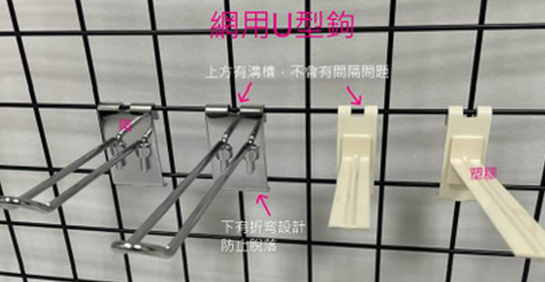 A: 針對不同的背板系統,我們有對應的洞洞板掛鉤、槽板掛鉤、網片掛鉤 (網用鉤)以及扁管掛鉤。若您不確定孔徑或規格,歡迎聯繫順元,我們將推薦最適合您的陳列掛鉤。